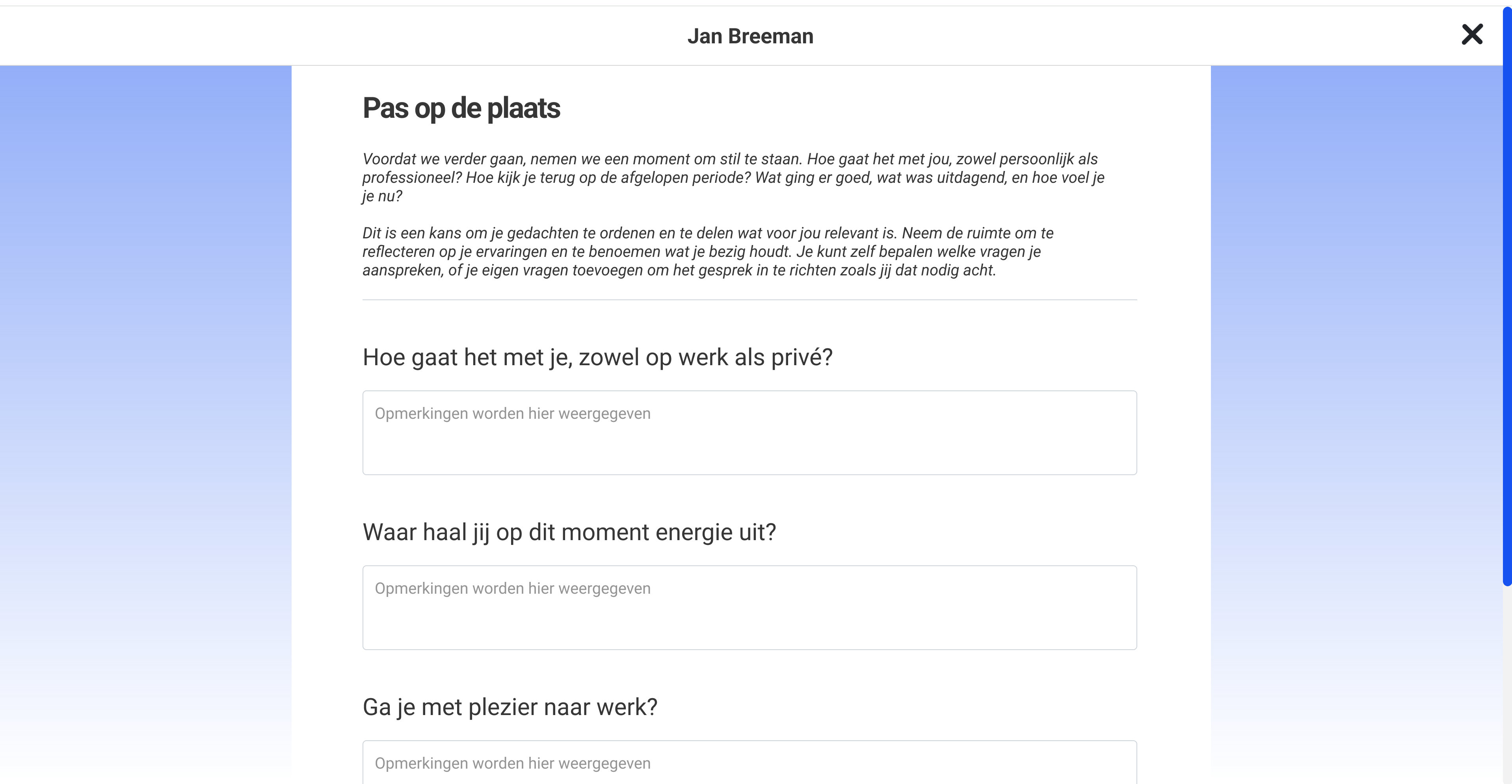 Daarom is er in het evaluatieformulier bewust ruimte voor reflectie en open vragen. Over werk, energie, samenwerking en wat iemand bezighoudt, op een manier die past bij het gesprek.